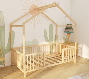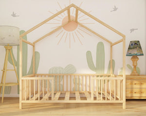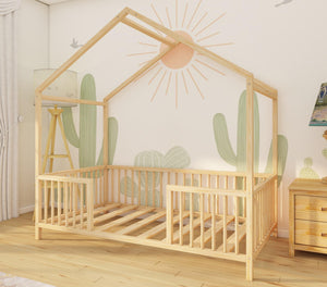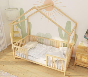 Cedar is a canopy, playhouse-style bed with a centered entrance, cylindrical slats and with legs. Our model without legs is Cynthia.