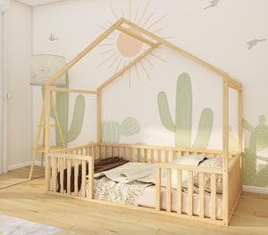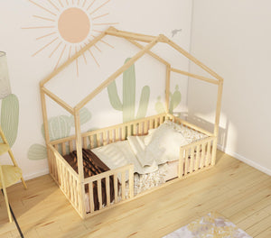 Cindy is a playhouse-style floor bed, with a centered entrance and rectangular slats