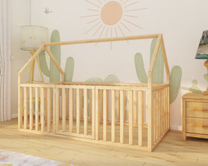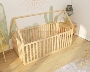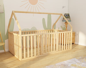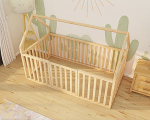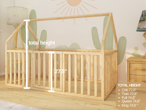 Perfect for your playroom or bedroom, Myra is a playhouse-style bed, centered entrance, with a choice of slats and high rails measuring 27”. Pictures feature the rectangular prism slats.